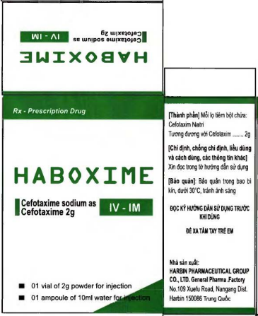 Tiêm bắp: dung môi là nước cất pha tiêm. Dung dịch được tiêm sâu vào cơ mông HABOXIME (Cefotaxim 2g) được chỉ định tiêm bắp, khi được chia liều và tiêm ở 2 bên mông Nên tiêm tĩnh mạch nếu liều mỗi ngày vượt quá 2g hoặc nếu HABOXIME được tiêm 2 lần/ngày.