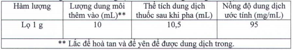 Lọ 1 g; 2 g bột thuốc, kèm ống dung môi để pha.