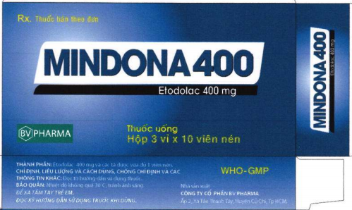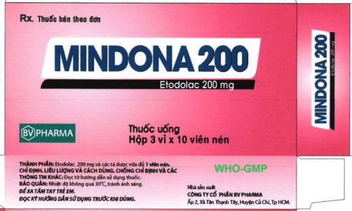 Mindona 200 là thuốc giảm đau chống viêm không steroid với hoạt chất chính là Etodolac. Etodolac là một dẫn chất của Acid pyranocarboxylat, có tác dụng chống viêm, giảm đau và hạ nhiệt. Cơ chế tác động của Etodolac là qua ức chế chọn lọc trên enzym Cyclo-oxygenase – 2 (COX-2) trong quá trình viêm. Tác dụng giảm đau có hiệu quả sau 30 phút khi dùng thuốc với liều đơn từ 200 mg – 400 mg, hiệu quả tối đa đạt được trong 1 – 2 giờ và thường kéo dài từ 4 – 6 giờ.