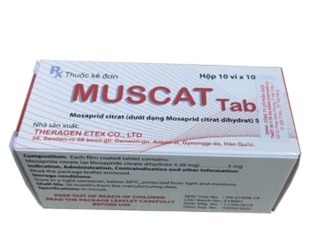 | Các thuốc có hoạt tính kháng cholinergic: Atropin, Butyl scopolamin… | Do tác dụng của mosaprid citrat có thể giảm khi sử dụng chung với các thuốc kháng cholinergic, lưu ý dùng các thuốc cách xa nhau | Do tác dụng làm tăng nhu động đường tiêu hóa của thuốc được giải thích bằng cơ chế kích hoạt thần kinh giao cảm, các thuốc kháng cholinergic có thể ức chế tác dụng này. |